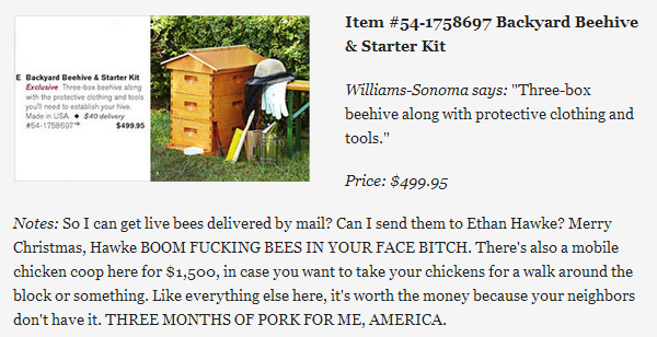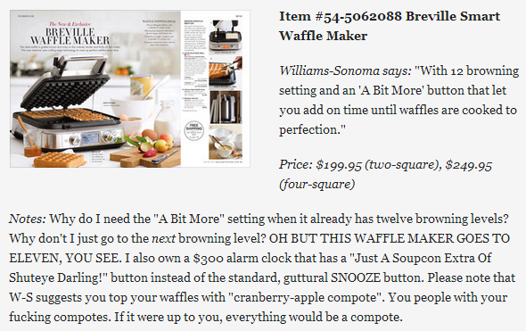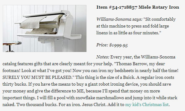 Every year (for two years, I know) some snarky dude at Deadspin (OK he’s pretty legit with books and stuff but that doesn’t make him an arbiter of taste) snarks all over the Williams-Sonoma holiday catalog. So rude, like snarking on the Neiman Marcus Holiday fantasy gift book. That’s for jealous people.
